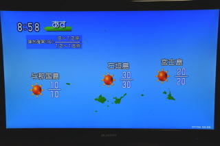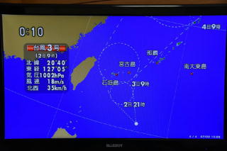 3時現在、台風3号が 石垣島付近を通過中。 石垣島地方に暴風・波浪警報が出て いるが、与那国島地方には出ていない。 天気図では暴風域は、ない。 外に出てみたら、風が少しあり、 星が見えるものの、雨がどこかから 飛んで来ている、といった具合。 今日、与那国島を発つ予定の人たちは、 飛行機が飛ぶかヤキモキしている。 今日、与那国島で潜る予定の人たちは、 ダイビングできるかヤキモキしている。 5時半頃になって、石垣島地方の 暴風警報は解除されたが、 波浪警報は引き続き出ている。 与那国島地方は波浪注意報。 |
