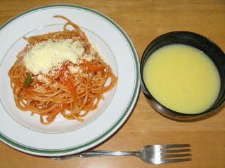 昼メシは俺が大好きなナポリタン! タバスコとチーズをたっぷしかけて食す。 お椀に入ったコーンポタージュスープも なかなか。 あ、俺は左利きなので、 フォークは左手で持つから こういう向きです(箸は右だけど。)。 |