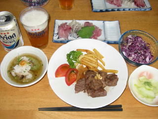 晩メシ。今日はステーキだ! しなっこい食感がたまりまへん。 さっきのお魚も刺身で付いた。 その他潮汁もあったけど、 俺は呑んでたので食さなかった。 |