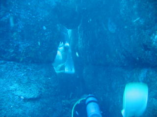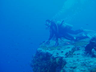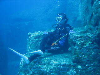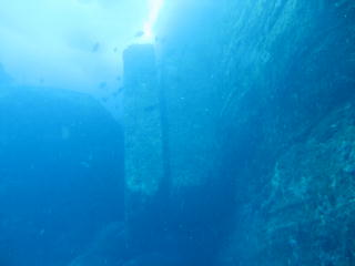 海底遺跡の向かいの岩の上で ポーズを取るマダムダイバー。 こうやって遊べるのが楽しい。 できればメインテラスに腰掛け られれば、なおよかったね。 |