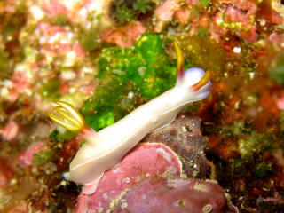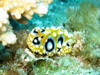 サンゴに上にはキイロイボウミウシ (殻を持たない貝の仲間。)。 触角(ツノみたいなの。)がある方が 前なので、コイツはこっち向き。 |