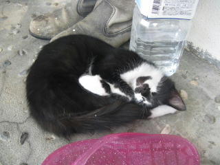 店の入口横で ひっくり返って寝ている「クロ」。 |