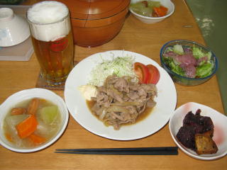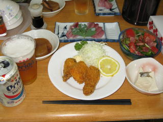 晩メシは、カジキのフライに島豆腐。 これはオリオンが進むぜぃ。 |