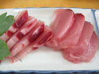 刺身だけを撮り忘れたので ←の写真から切り取った。 赤味がかっているのが、やいまでは ほぼ定番のオオクチハマダイ。 割と大きくなる魚。 白身が、内地では高級魚のメイチダイ。 葉っぱは長命草。 その辺にフツーに生えている(笑)。 |