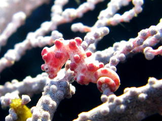 1本目は、深場で ジャパニーズピグミーシーホース狙い。 -38mに見事に4匹もいて、 これはそのうち1番大きな個体。 それでも1cmちょっとぐらい。 他にゲスト(客)はいなかったので 独占して撮影できた。 深場での撮影は 時間が数分しか取れないのに、 撮影開始の時にデジカメのディスプレイが 表示されずに焦った。 結局は表示設定がいつの間にか 節約モードになってしまっていたためで、 落ち着いて改めて設定して復活した。 このことがなく、 最初から撮影できていれば もう10枚は多く撮れたので、 事前に確認を重ねることの重要性を、 またしても痛感させられた。 |