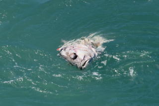 出港時の久部良港内に でっかいお魚の生首が浮いていた。 相当でかかったよ。 タテに70〜80cmはあったと思う。 |