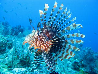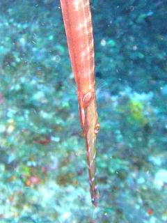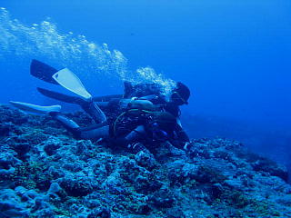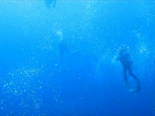 まーまー流れている西崎(いりざき)で 大物待ち。 「まーまー」といっても、 写真の手前の女の子ダイバーは つかまるだけで必死。 エアがほとんど真横に流れてる。 |
