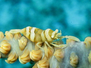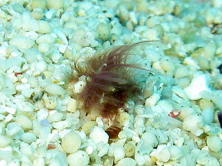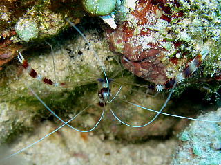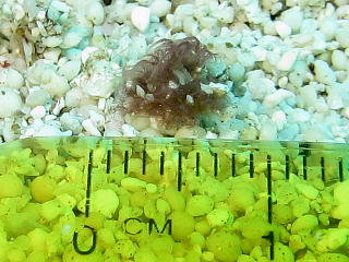ムチカラマツエビ。 ハサミ部分を除いて約1cm。 ちょろちょろ動かない個体だったので、 定規で測定できた。 |