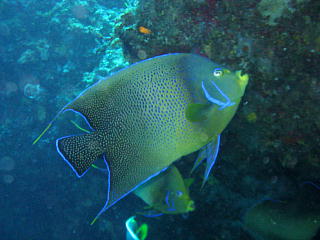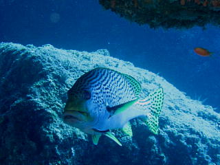 エダサンゴにハナゴイ(yg)。 | ハナゴイ(yg) | オーバーハングの岩の下にいた チョウチョウコショウダイ。 |