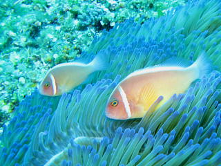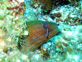 ハナビラクマノミ | ゴマウツボ。 ホンソメワケベラがクリーニングしている。 |