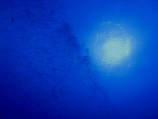 -45mから見上げる。 グルクンの群れと、他のダイバーのエアと、 お日様と。 |