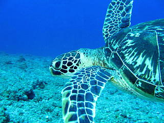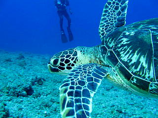 ウミガメくんと並泳。 | おアソビでバックのダイバーを消してみた。 これは加工写真です。 |