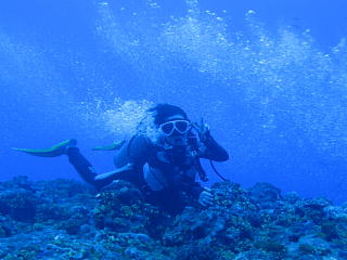 ←と同じときの同じ場所。 この女子ダイバーは余裕余裕。 写真を撮ったときは気付かなかったが、 後で確認したらVサインまでしてやんの。 で、このお方は、実はYDSの緑さん(笑)。 |