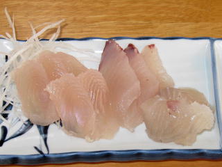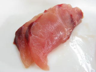 ある日のYDSの晩メシに出てきた バショウカジキの刺身。 一切れの中に歯ごたえがある部分と、 もっちりした部分が両方あり、 なかなか旨かった。 |