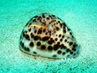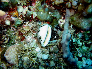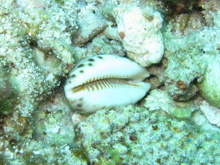 ホシダカラ。 砂地にポツンといた。 でっかくて喜んだが、生貝だったので、 持って帰ってこなかった。 |