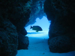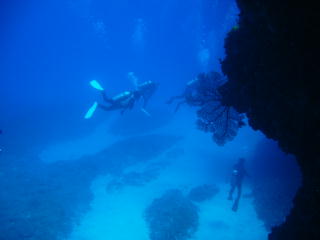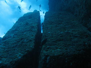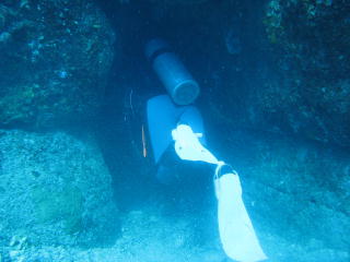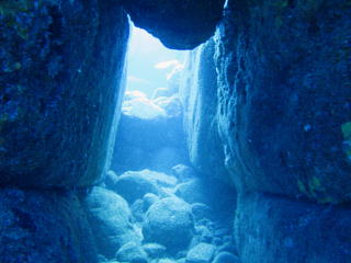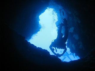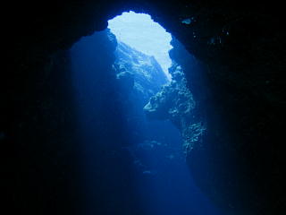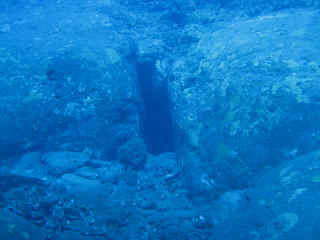 ダイバー1人がやっと通れる幅。 | 「城門」を抜けて振り返ると、 何とも不気味な穴がぽっかりと 開いている。 |
