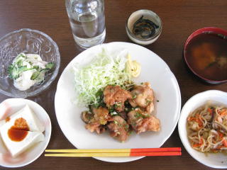 YDSの、ある日の晩メシ。 3食で1番豪華。 日によって、海人差し入れの 刺身などが付くこともある。 |
