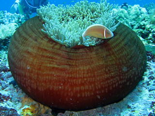 なにこれ? | ミツボシクロスズメダイ(yg) | イソギンチャクは補食中で こういう風に丸まっている。 火鉢みたい(笑)。 当たり前だけど、ハナビラクマノミが 喰われているのではないよ。 |